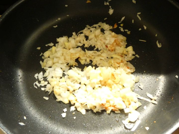 2.フライパンにごま油をひき、長ねぎ、しょうが、にんにく、豆板醤を炒めます。