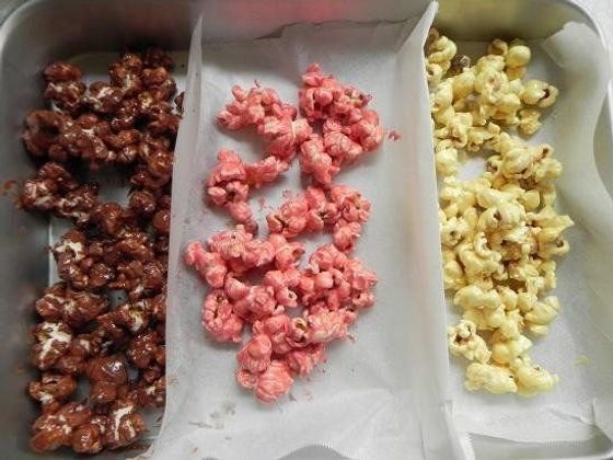 ポップコーンを3等分にして、それぞれ溶かしたチョコレートに絡めます。