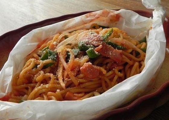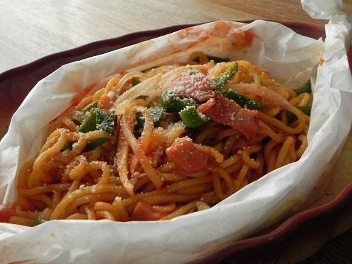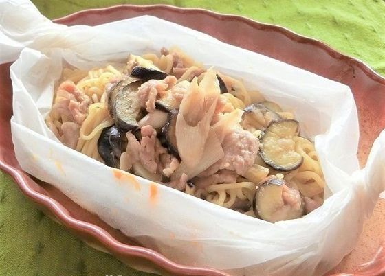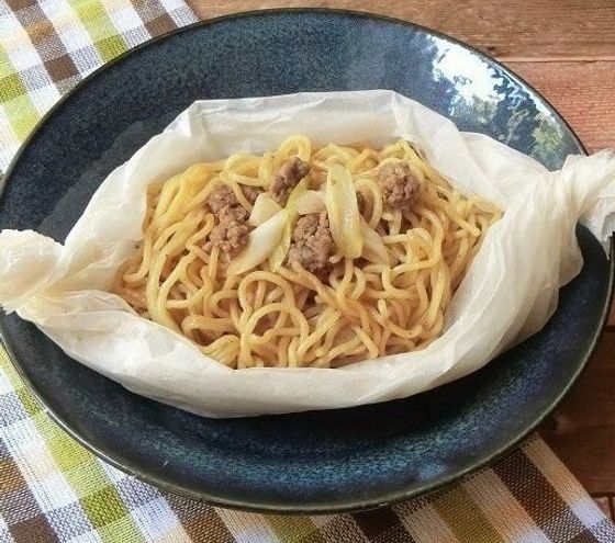 ②クッキングシートに麺、野菜、肉の順に乗せ、添付のソースを全体にかけます。