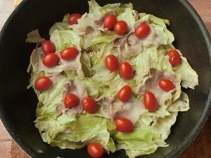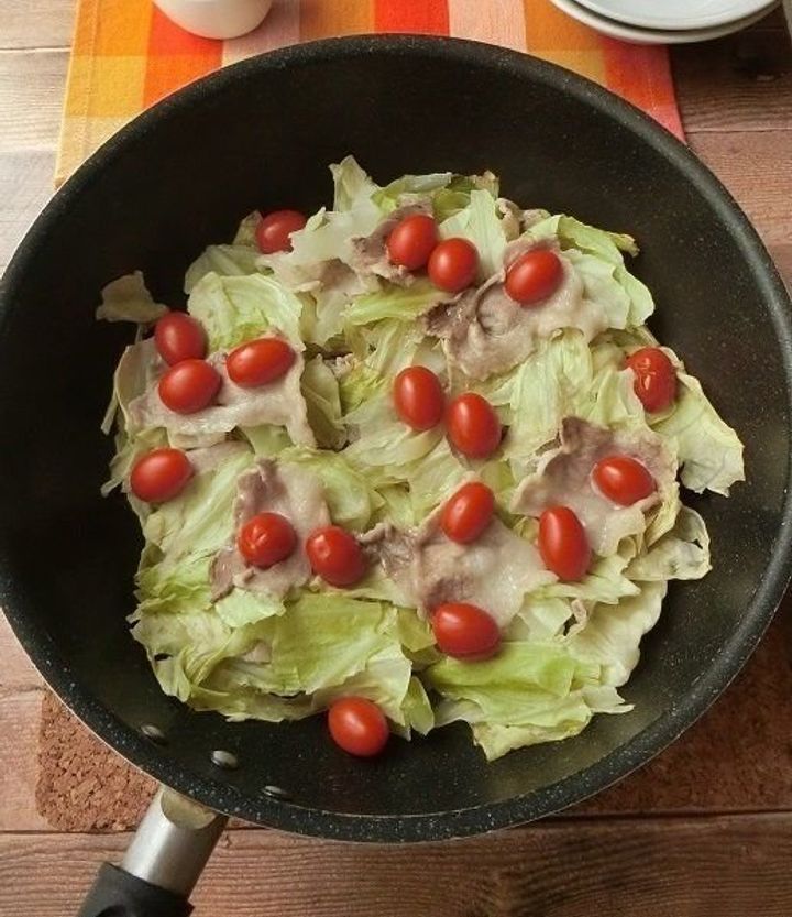 3.残りのキャベツと豚肉を乗せ、プチトマトを散らします。水を大さじ1(分量外)を入れて蓋をし、中火で10分蒸します。