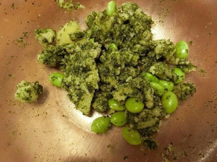 4.枝豆は電子レンジ600wで1分加熱し、さやから出して青海苔と一緒にじゃが芋1/3に混ぜ合わせます。