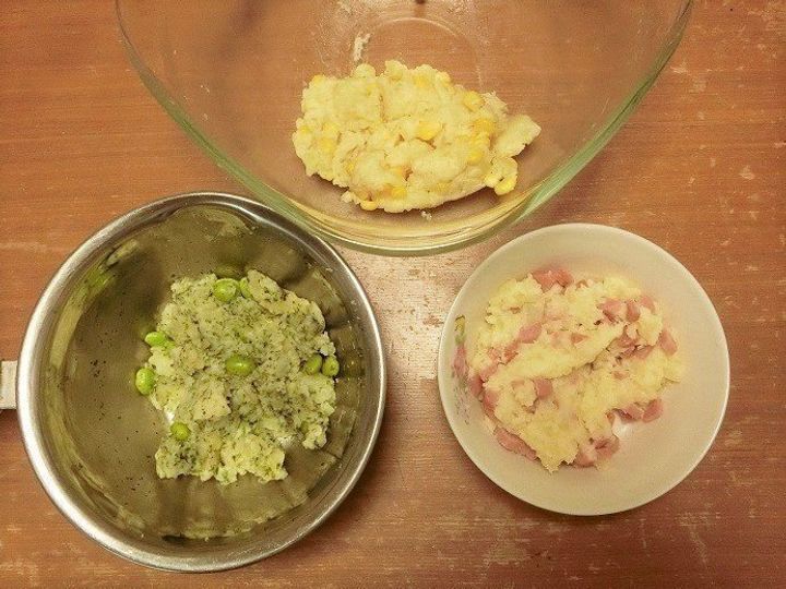それから3等分にして、味付けを変えて具を足すことで簡単に3種類のポテトサラダを作ることができます。