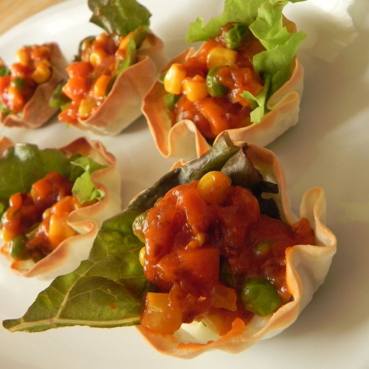 餃子の皮などをカップにしても可愛くて美味しいです。片栗粉を混ぜ合わせて電子レンジ加熱すると、とろみがつくのでクラッカーなどに乗せやすいです。