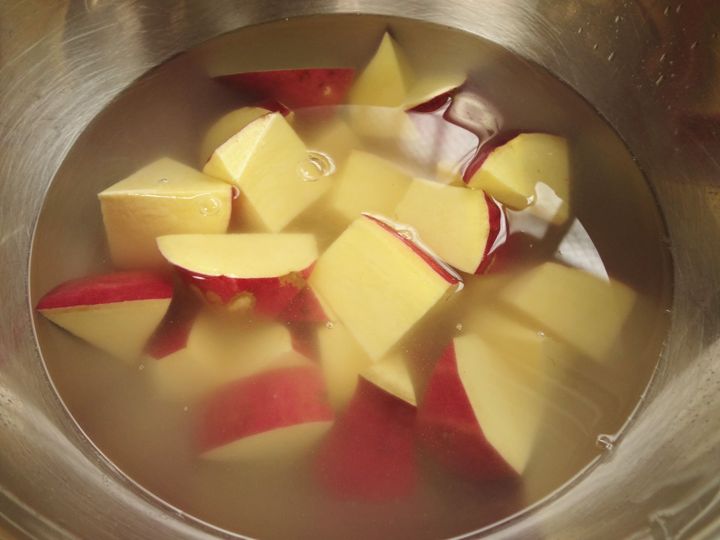 さつま芋はよく洗って皮付きのまま乱切りにし、水につけます。少し水につけたらペーパーでしっかり水を拭き取ります。