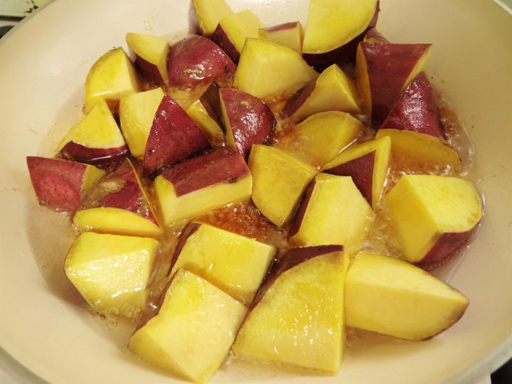 フライパンに油、砂糖、しょう油、水を入れ、さつま芋の皮を下にして並べます。