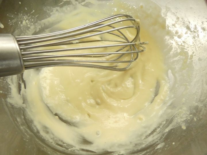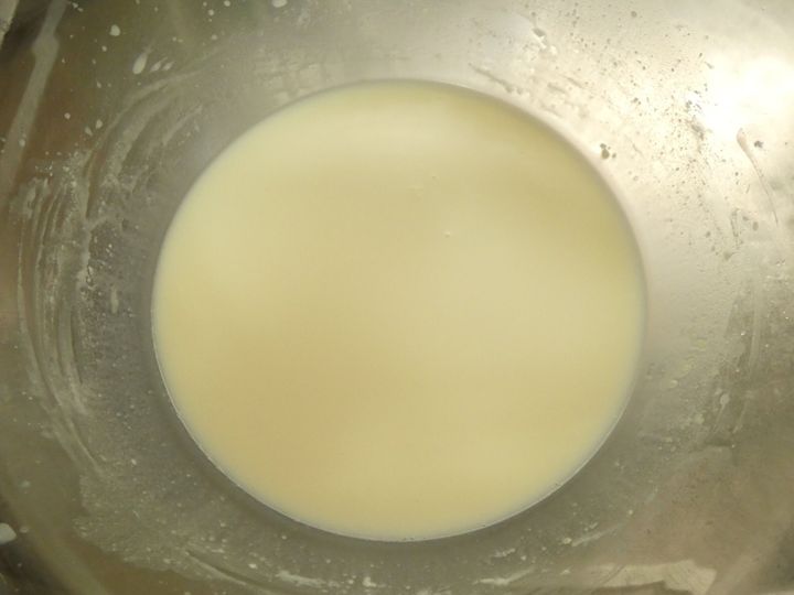 2.よく混ぜ合わせたら、牛乳を少しずつ加えて混ぜ合わせます。