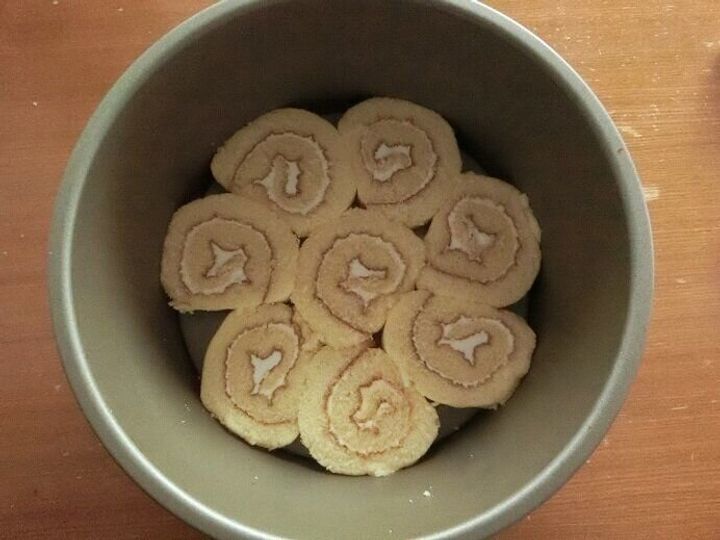 2.ロールケーキは厚さを半分に切り、ケーキ型に敷き詰めます。
