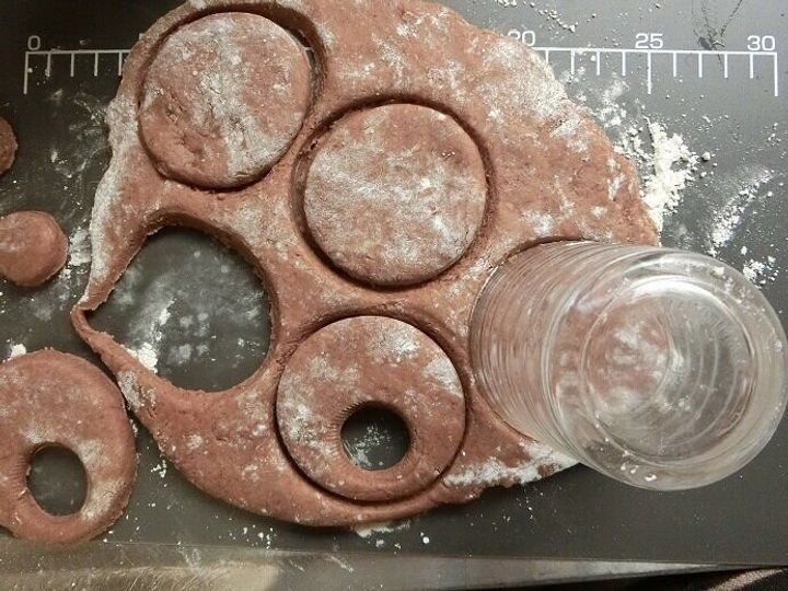 リング状に型抜きをするときは、コップとペットボトルのキャップがあればOK。ちょうどいい大きさで、コップに粉をつけてねじるようにしながら型抜きすると上手く出来ます。