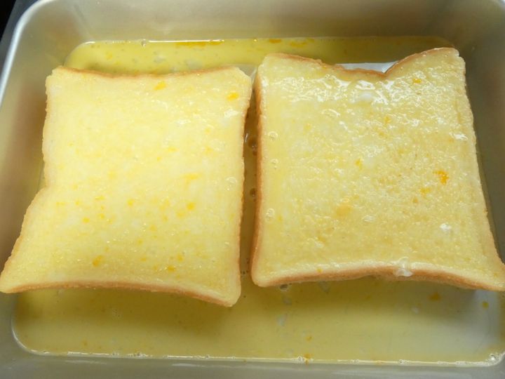 バットに卵、牛乳、砂糖を入れてよく混ぜ合わせ、食パンに卵液を両面しっかりと染み込ませます。