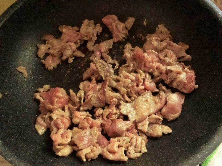 3.フライパンにごま油と豚こま肉を入れて中火で炒めます。