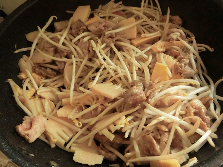 4.豚こま肉の色が変わってきたら、タケノコともやしを入れて炒めます。合わせておいたBの調味料を加え、強火でさっと炒めたら完成。