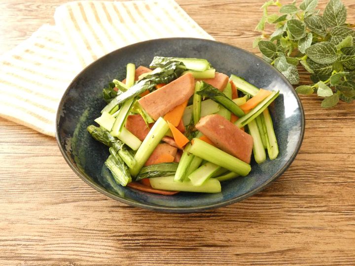 野菜と一緒に炒め合わせるだけで簡単1品になります。野菜はキャベツや人参、きのこ類やもやしなど何でもOK。ランチョンミートに焦げ目がついて野菜がしんなりしたら、塩こしょうやしょう油などお好みの味付けをしてください。