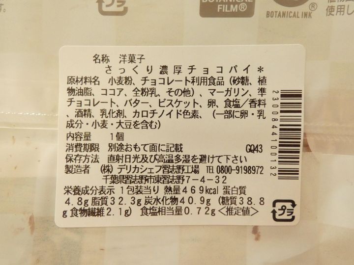 栄養成分表示を見ると1個のエネルギーは469kcal。パイにチョコレートがたっぷりなのでカロリーが高めなのは予想していましたが、ここまで高カロリーとはビックリです。