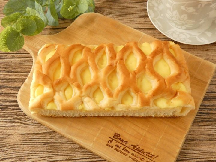 表面は編み目になっていて、ふわふわ柔らかいです。パン生地にはクリームが折り込まれていて、チーズクリームを絞って焼いてあります。