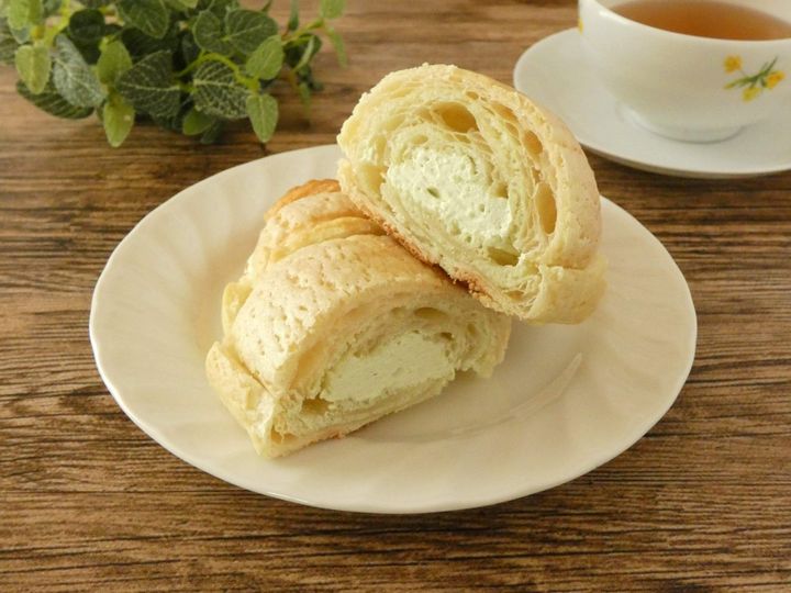 カットしてみると断面がキレイ!!デニッシュ生地に緑色のメロン生地が折り込まれているので2色が層になっています。クリームはたっぷり入っていて、こちらもほんのり緑色をしています。