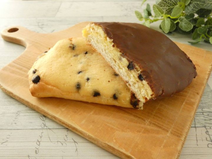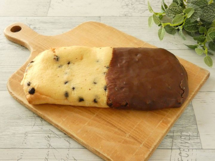 パンの表面は半分だけがチョココーティングされています。パン生地の上にはケーキ生地を乗せてあり、中にはチョコチップがたくさん入っています。