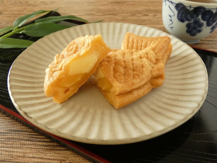 手のひらサイズで、南九州産(鹿児島県・宮崎県)のさつまいものペーストを使ったスイートポテトクリームと、ミルク風味のカスタードクリームを中に詰めたたい焼きです。
