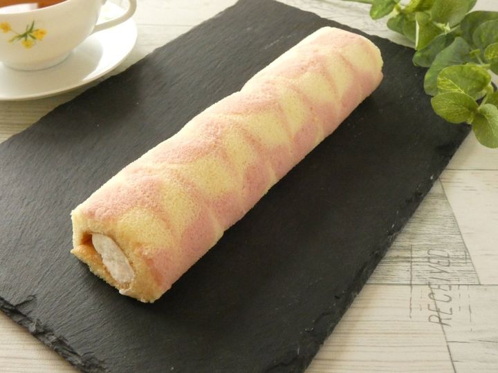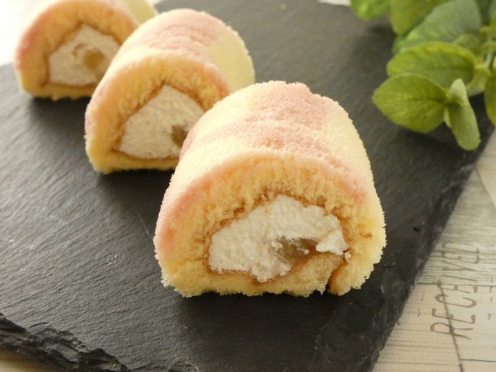 表面が桃色のかわいい模様になっているスポンジケーキに、ヨーグルトクリームと白ももの果肉入りジャムが巻いてあります。