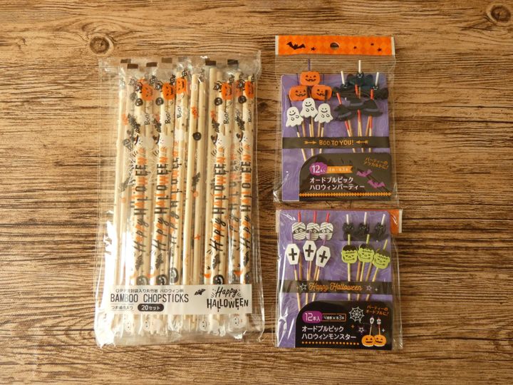 ハロウィン柄の袋に入った丸竹箸は20セット入りで110円。楊枝と箸が1セットずつ袋に入っているので衛生的です。