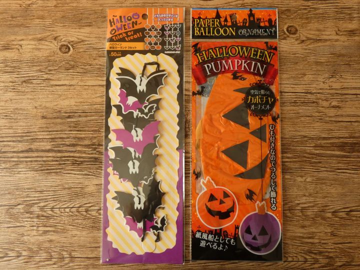 かぼちゃの紐付きペーパーバルーンは1個110円。膨らますと直径20㎝になり、紐の長さは32㎝。飾る場所に合わせて紐を調節でき、使い終わったら紐を切って紙風船として遊ぶことも出来ます。