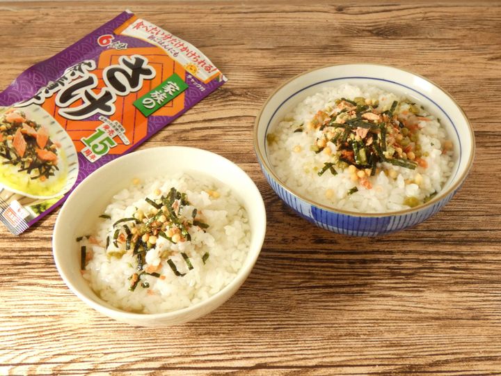 丸美屋「家族のお茶漬けシリーズ」は小袋タイプではなく食べたい分だけかけられるお茶漬けの素で、量の調節がしやすいです。