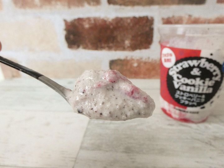 なめらかアイスに苺の果肉とクッキーのゴロゴロ食感がおいしい!!初めはバニラ強めのフラッペですが、どんどん食べるとストロベリーが強く感じるようになります。食べている最中も容器の下からよく混ぜ合わせると、ストロベリー感アップ。