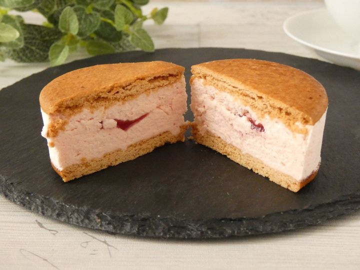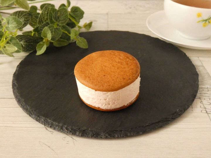 手のひらサイズのスイーツで、こんがりと焼いたビスケットに苺のバターチーズクリームがたっぷり入っています。