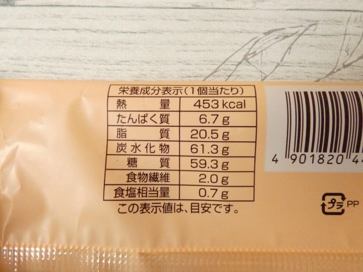 栄養成分表示を見ると1個のエネルギーは453kcal。このボリュームのデニッシュ生地なので、予想通りのカロリーの高さです。