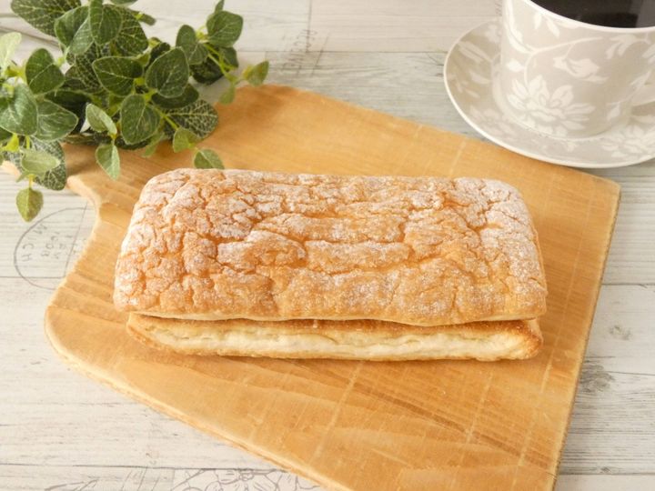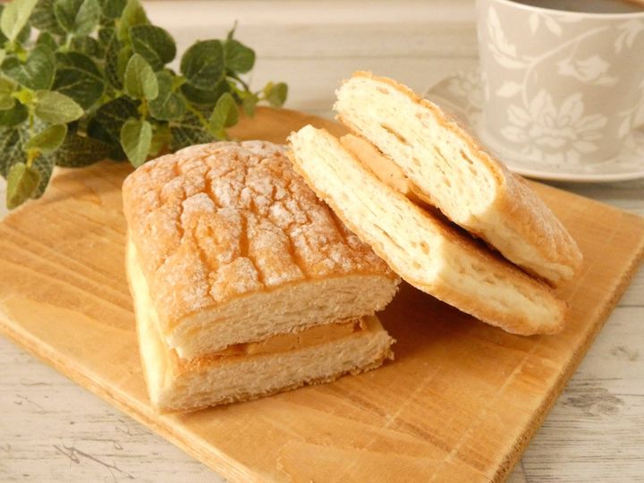 カットするとクッキー生地はサクサクで、デニッシュ生地は厚みがあります。キャラメルクリームは端から端までしっかり入っています。一口食べるとクッキー生地は食感がよくて、デニッシュ生地のボリュームがたっぷり!キャラメルクリームは濃厚でねっとりしていますが、塩気がしっかりあるので後味がさっぱりしてペロリと食べられます。大口を開けないと食べられないくらいの厚さで食べ応えバッチリ。大満足のスイーツパンなので、ぜひお試しください。