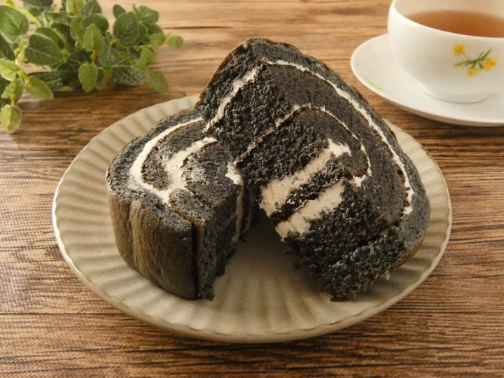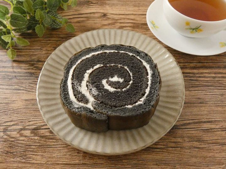 ウマ娘プリティーダービーコラボ商品で、ゲーム内で登場するタイヤをイメージしたロールケーキです。竹炭入りの黒い生地にバニラ風味のクリームを巻いてあります。