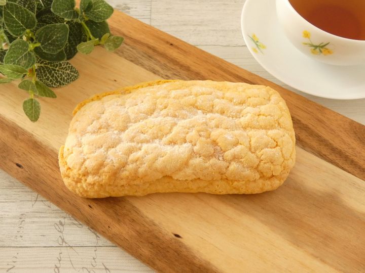 はちみつレモン風味のマカロン生地を被せたパンで、ボリュームたっぷり。中にはクリームチーズ風味のホイップクリームとはちみつレモン風味ソースがはさんであります。