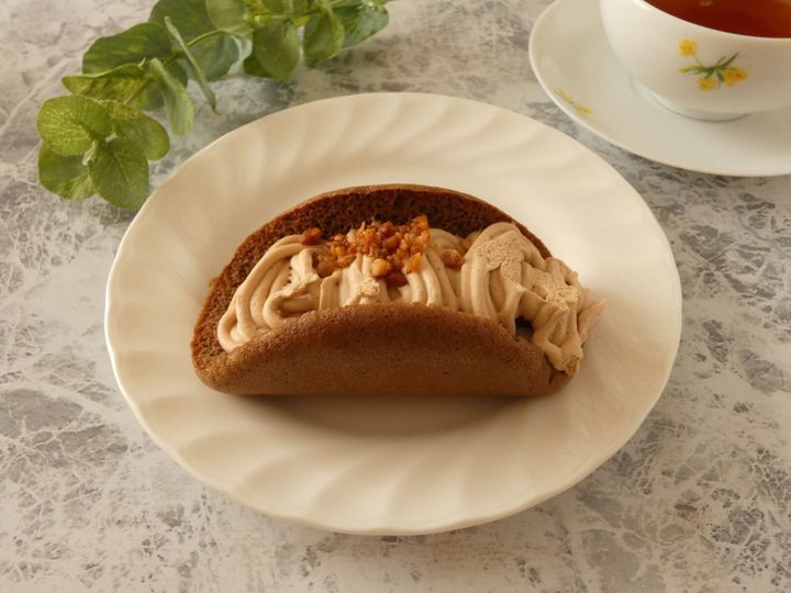 取り出すだけでつぶれてしまいそうなくらいふわっふわの生地はココア味。ホイップクリームとイタリア栗のマロンペースト、モンブランクリームが包まれていて、上にはアーモンドがトッピングしてあります。