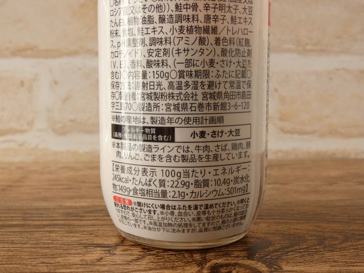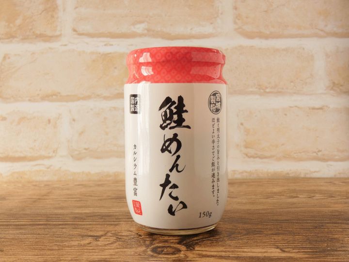 蒸し鮭と辛子明太子が混ぜ合わせてある、ビン入りの「ごはんのお供シリーズ」。鮭の中骨入りなのでカルシウムたっぷりです。