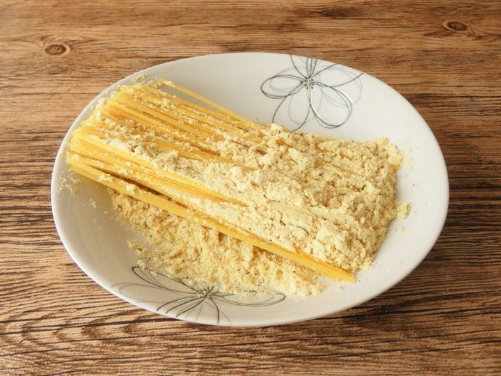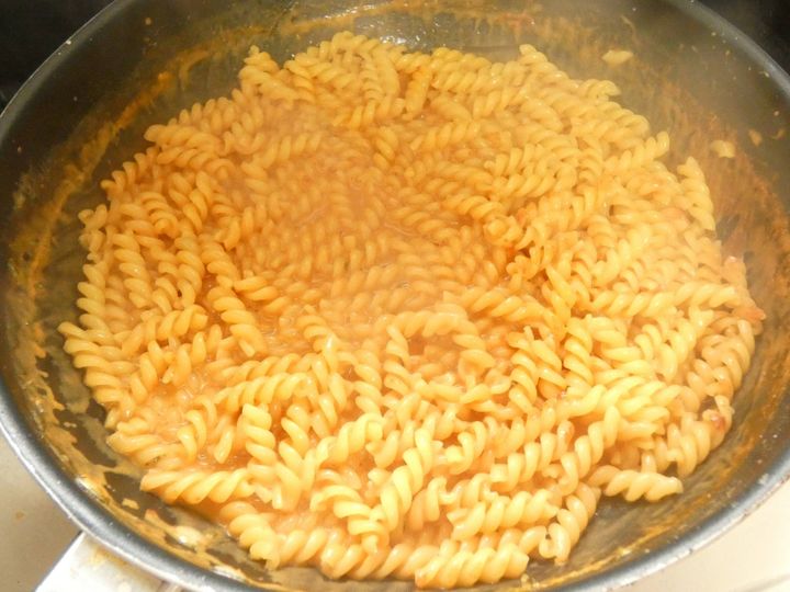 深めのフライパンに水500ccを入れます。沸騰したら乾燥パスタと粉末ソースを入れて軽く混ぜます。