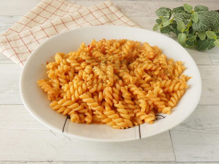 トマト&チーズパスタはらせん状のショートパスタ「フリッジ」を使っています。トマトのとチーズの組み合わせバッチリ。トマトの酸味は強すぎず、まろやかであっさりした味わいでパスタにソースがしっかり絡みます。