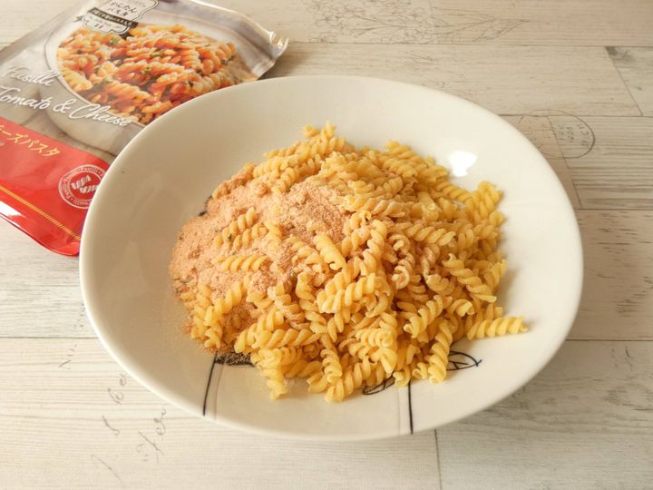 中を開けると乾燥パスタと粉末のソースがセットになっています。つくり方は簡単で、用意するのは深めのフライパンと水だけでOK。