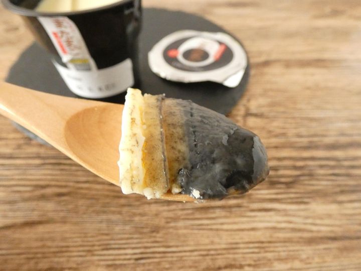 すくってみると一番上のホワイトチョコが思ったより厚め。スプーンを入れてもなかなか割れず、バリッと割ると全体がバリバリ割れてしまいました。すくうと4層になっているのが分かりカステラはしっとり。黒ごまプリンはなめらかな食感で黒ごまの香りがいっぱい広がります。黒ごまソースはとろ~り濃厚で、甘さは控えめですが黒ごまの香ばしさがたまらないです。