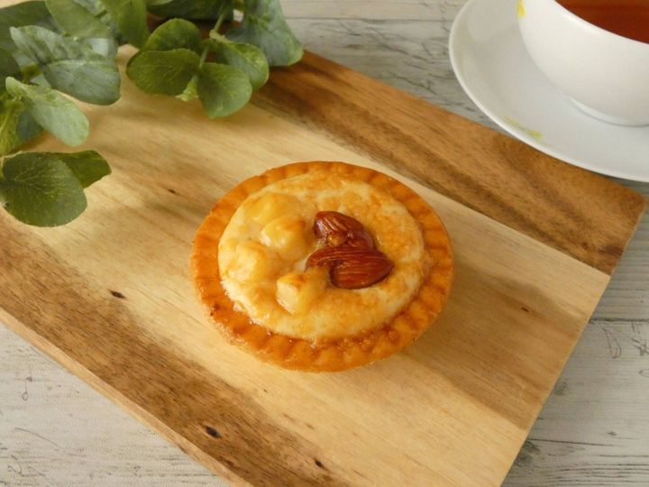 デンマーク産クリームチーズにゴーダチーズとカマンベールチーズをブレンド、焼成前にパルメザンチーズをトッピングしてある手のひらサイズのタルトで、上にはホールのアーモンドとキューブ上のチーズが散りばめられています。