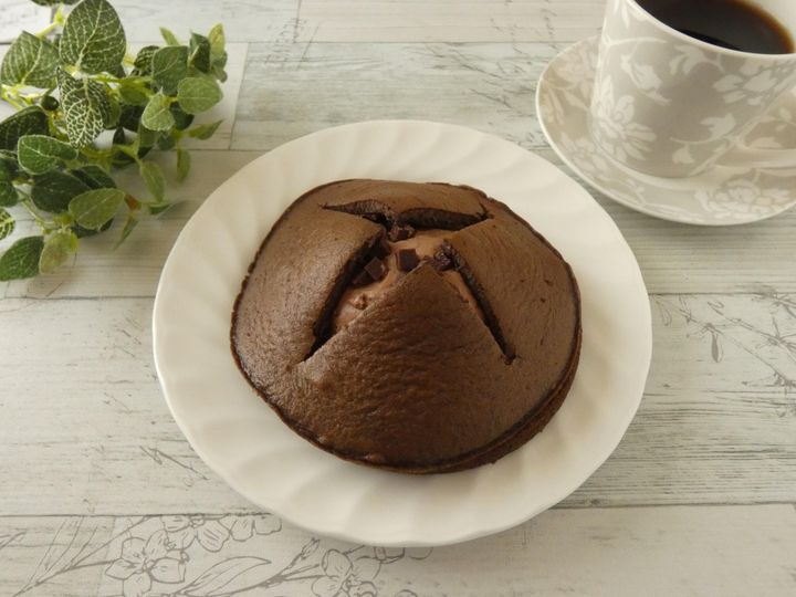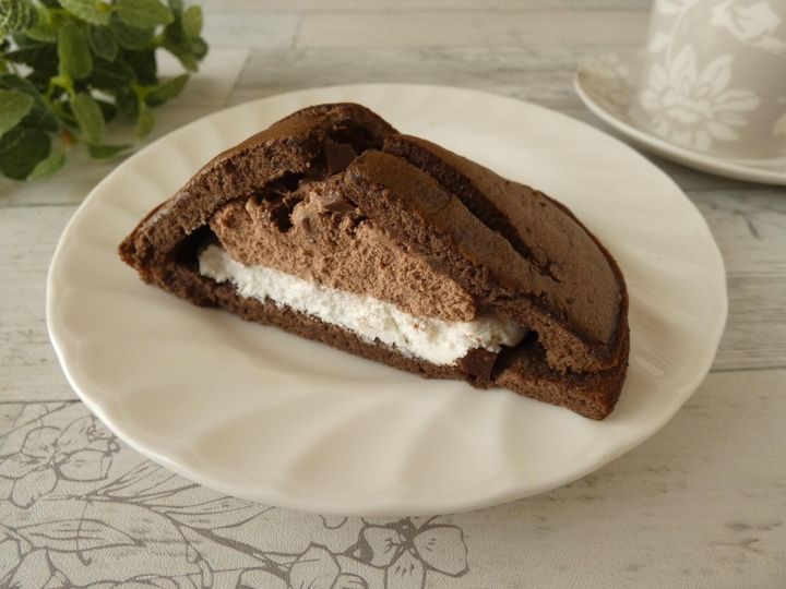 ココア風味のスポンジ生地にホイップクリームと生チョコクリームがたっぷり!キューブチョコもたくさん挟んであり、上には十字の切れ目が入っています。
