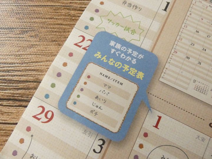 こちらも書き込むスペースは色分けされているので、家族の予定が一目で分かり便利です。1段ごとに誰の予定を書くか決めておくと、それぞれが書き込むときにもわかりやすいです。