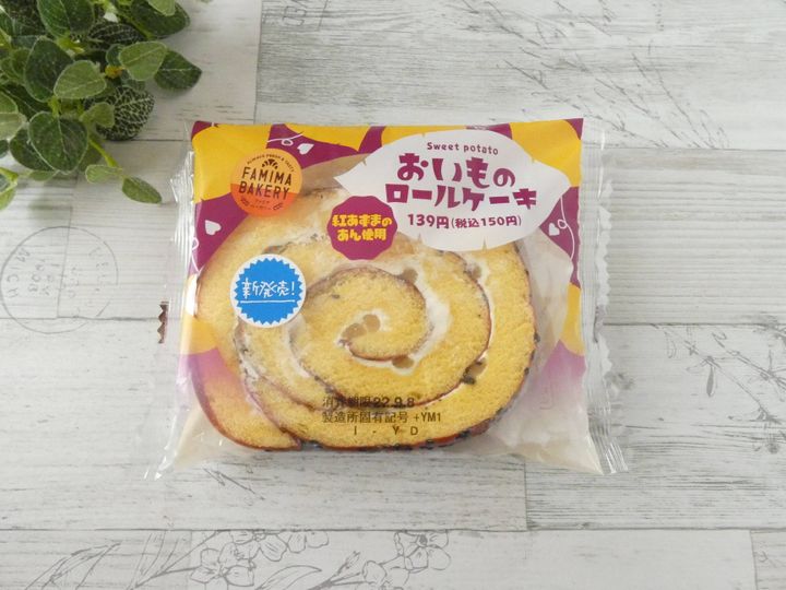 ファミリーマート新発売「おいものロールケーキ」は150円。さつま芋を連想する紫色と黄色のパッケージが目を引きます。