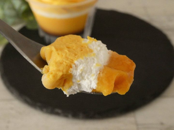 カラメルソースとかぼちゃプリン、ホイップクリームとかぼちゃクリームの4層になっていて、上には粉砂糖がかかっています。