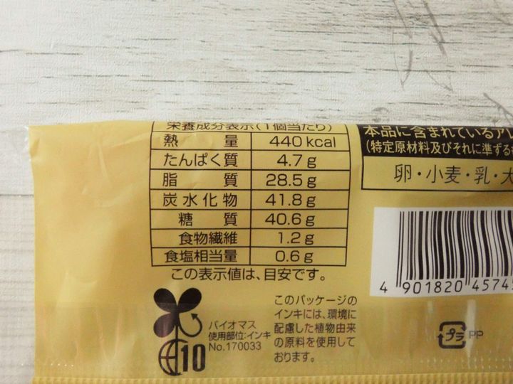 栄養成分表示を見ると1個のエネルギーは440kcal。ビスケット生地とデニッシュ生地に発酵バター入りなので、予想通りのカロリーの高さです。