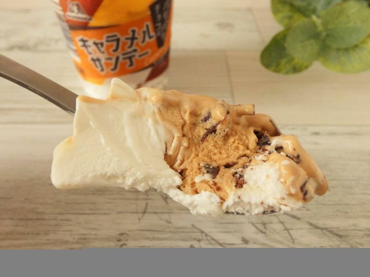 バニラアイス、キャラメルアイス、バニラアイスの3層に重なっていて、一番上はバニラアイスとキャラメルソースが合わさって絞り出してあります。
