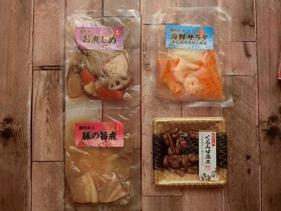 豚の旨煮、海鮮サラダ、お煮しめ、くるみ甘露煮。