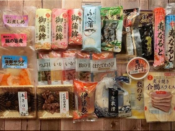 かまぼこだけでも赤、白、鯛入り、ふぐ蒲と4種類、紅白のなるとや田作り、伊達巻き、黒豆など少量パックが32種類。
