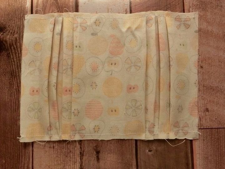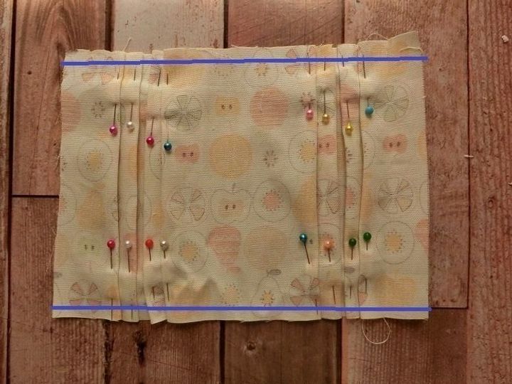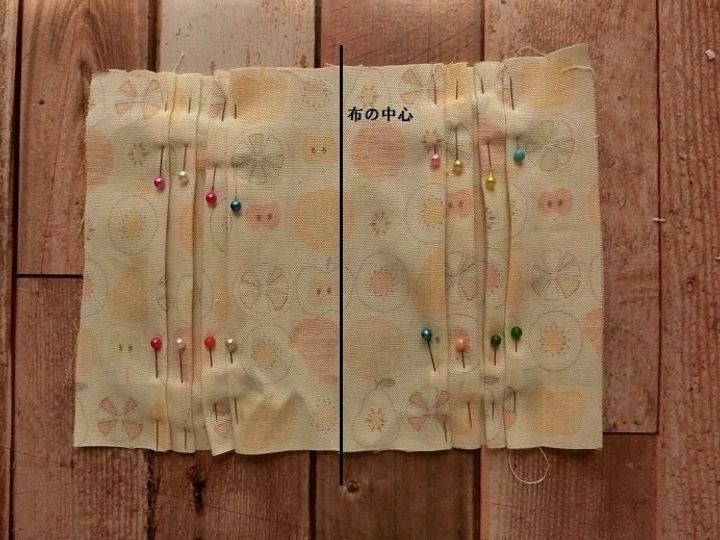 布の中心が分かるように印をつけます。マスクを横に並べておいて、マスクと同じ位置にプリーツが出来るように止めます。本当は上から何㎝の所を谷折り、山折りとするんだと思いますが、マスクと同じものが出来ればOKと思って、測らずに止めました。