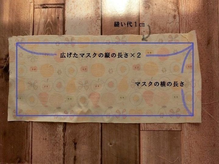 サイズはマスクの横の長さと、広げたマスクの縦の長さを2倍にした大きさ。これに縫い代1㎝を足して布を切ります。