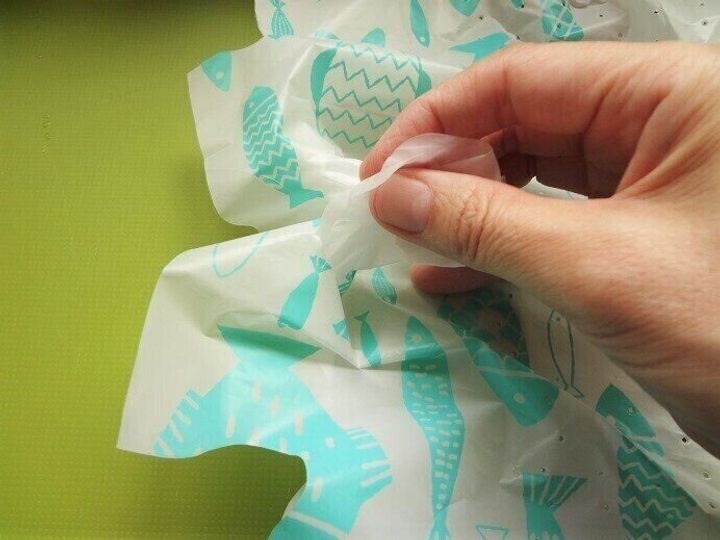 ゴミがいっぱいになったら、シールがついていない部分の持ち手のミシン目をゆっくり開きます。開いた穴にシールがついている持ち手を通します。