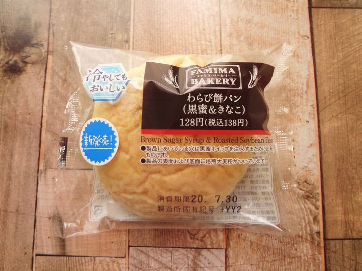 わらび餅パン(黒蜜&きなこ)は128円(税抜)。わらび餅と黒蜜ときな粉の組み合わせは和菓子好きにはたまらない!!そしてサイズが大きいことにビックリ。思わず手に取ってしまいました。